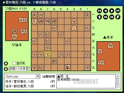 後手・都成六段が94手をもって、星野五段に勝利し決勝進出です。
